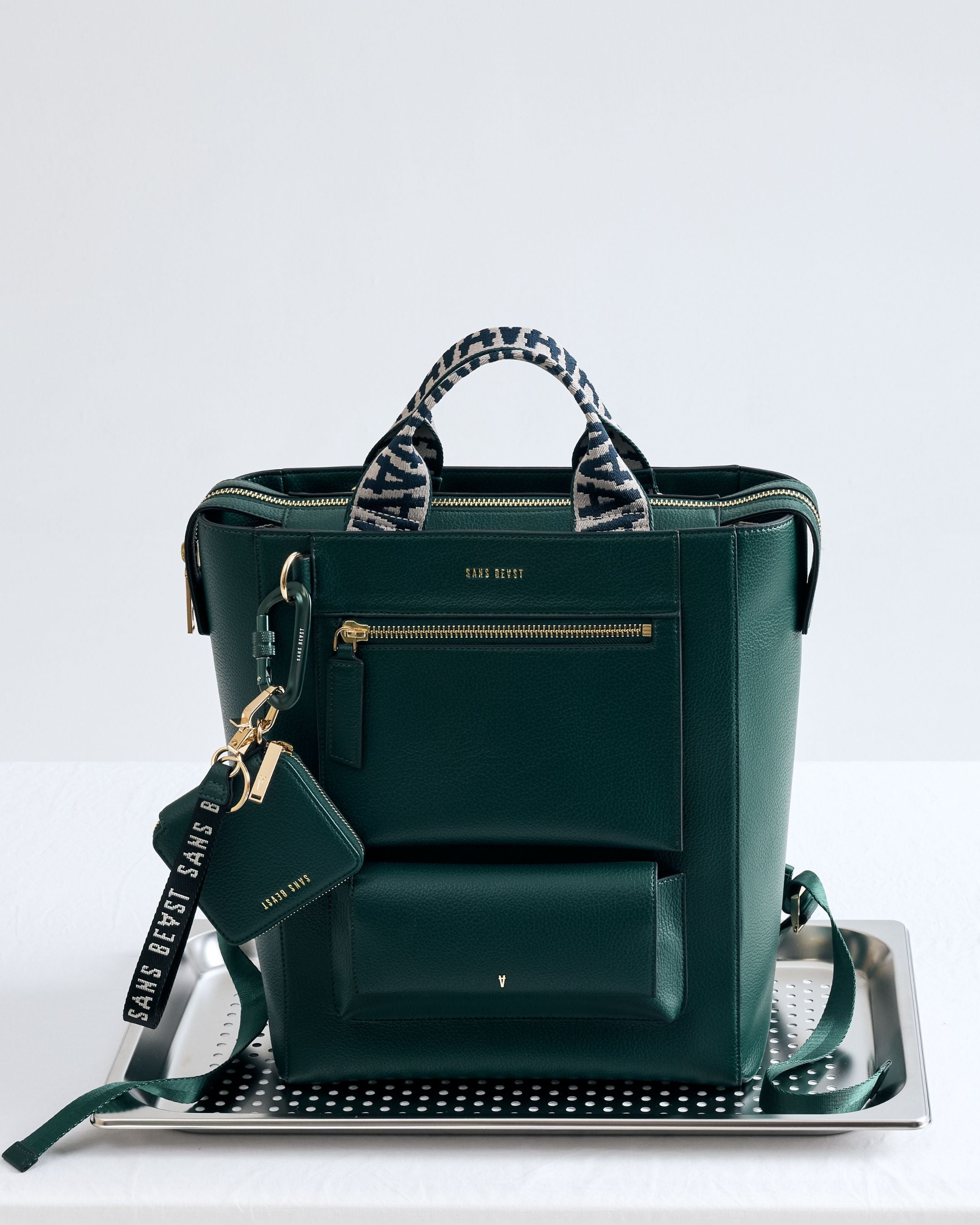 - - Integrated adjustable padded straps + short handles in Vanilla, Forest + Midnight multi toned webbing.